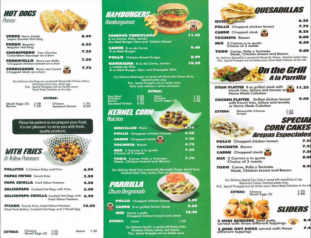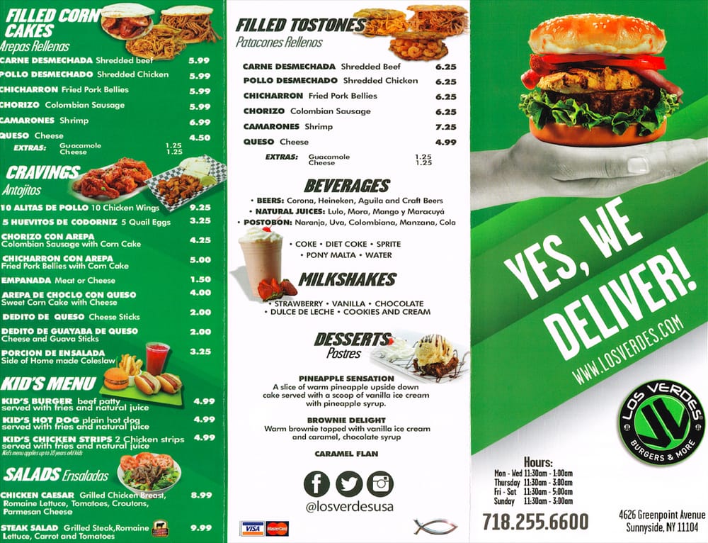 Introducing the menu at Los Verdes in Sunnyside, NY, a hotspot for Colombian-inspired street food. Known for their hot dogs, burgers, and arepas, this eatery offers a variety of options for lunch, dinner, and late-night cravings. With free delivery and a comfortable dine-in atmosphere, Los Verdes caters to all preferences. Customers rave about the flavorful dishes, such as the chicken sandwich, fries, and unique sauces. The BOGO deals on select days make it a budget-friendly choice. Don't miss out on the Cachapas - sweet corn cakes that are a crowd favorite. While the service can be hit or miss, the delicious and indulgent food makes up for any missteps. Whether you're a fan of hearty comfort food or looking to try something new, Los Verdes is a must-visit spot in the area.